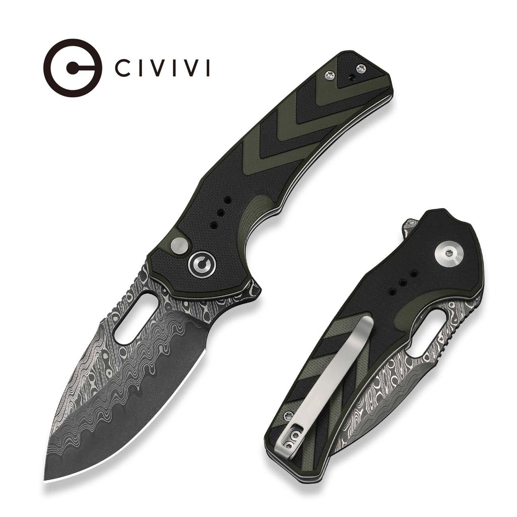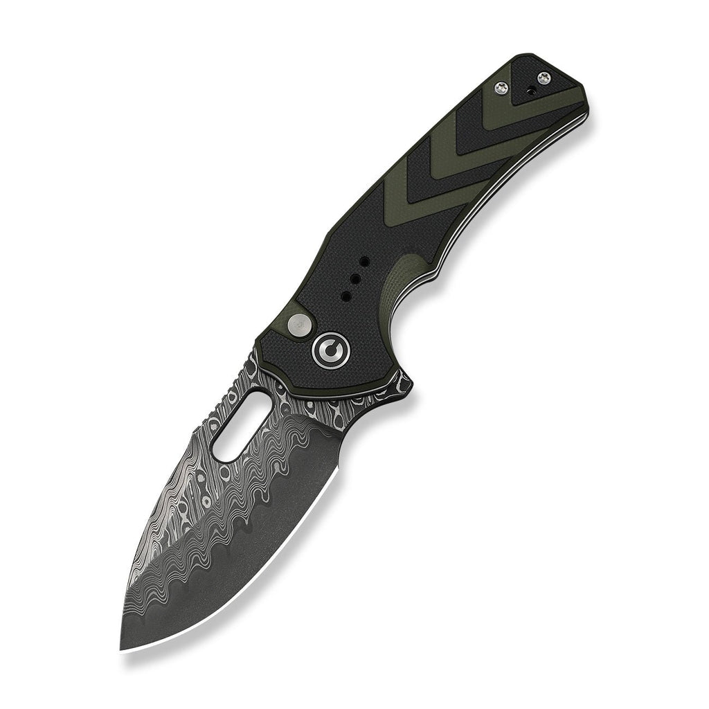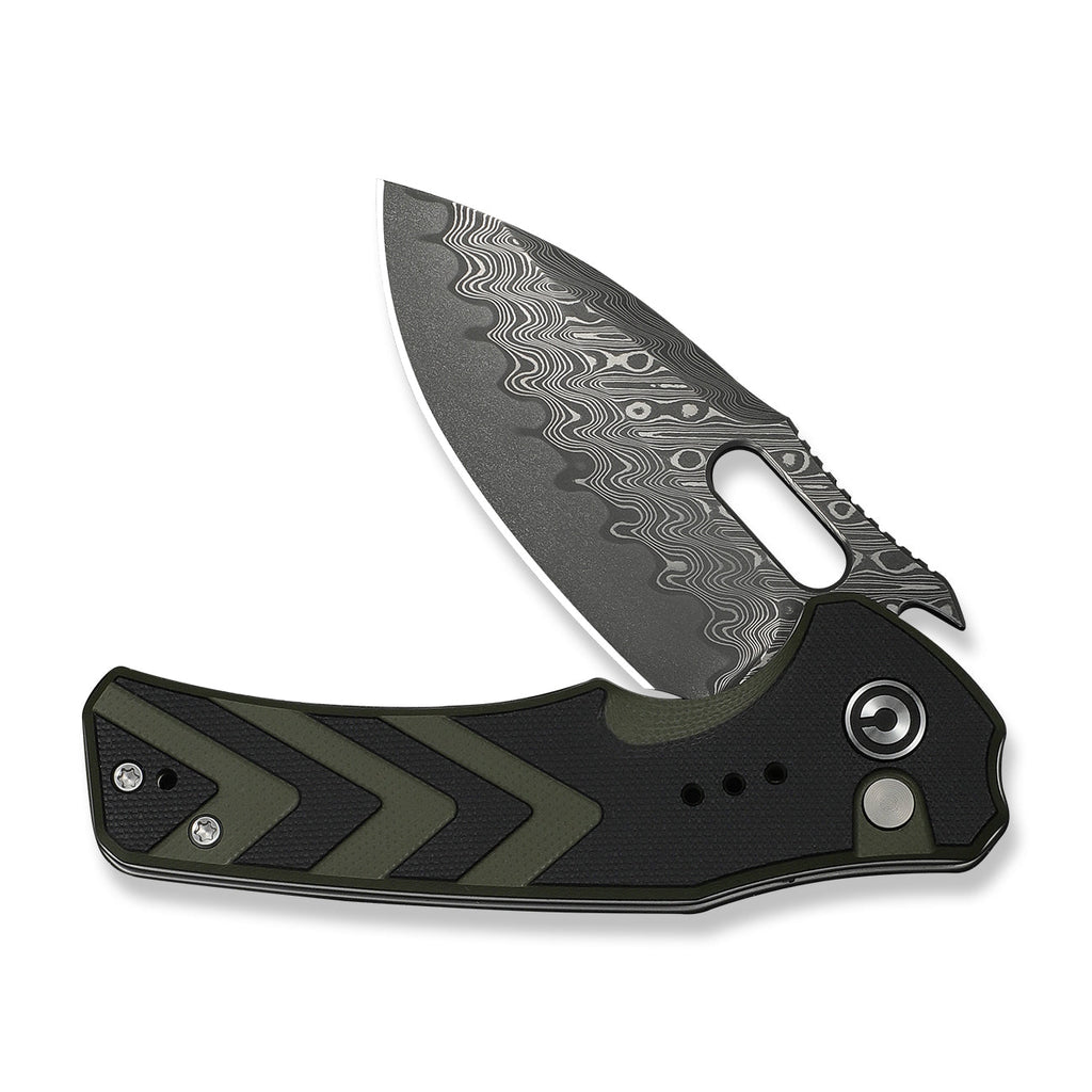 CIVIVI Vexron Flipper & Thumb Hole & Button Lock Knife Milled Black & Green G10 Handle (2.98" Damascus Blade) C24066-DS1